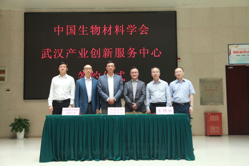 9月18日上午,由中国生物材料学会、国药集团中国医疗器械有限公司(以下简称“国药器械”)以及武汉国家生物产业基地建设管理办公室共同创建的“中国生物材料学会武汉产业创新服务中心”(以下简称“服务中心”)成立签约仪式在武汉生物办举行。三方达成合作意向,将共同助力武汉医疗器械产业实现转型发展。中国生物材料学会副理事长张胜民教授、秘书长艾华教授,中国医疗器械有限公司党委书记、总经理李杨,副总经理杜江,武汉国家生物产业基地建设管理办公室常务副主任钱德平等领导出席签约仪式。